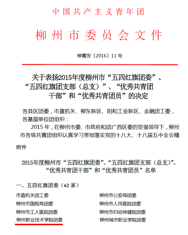 我院团委荣获2015年度柳州市五四红旗团委