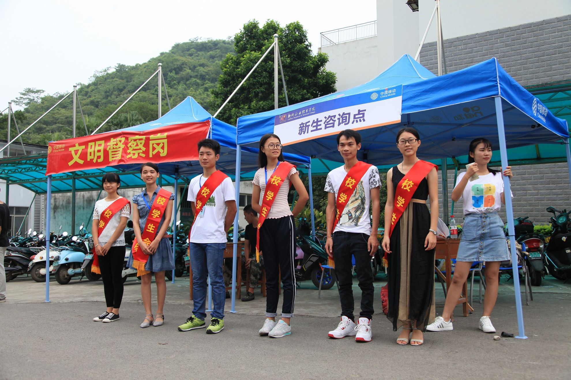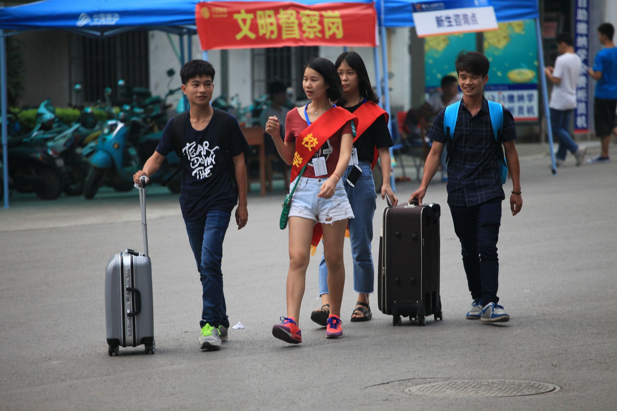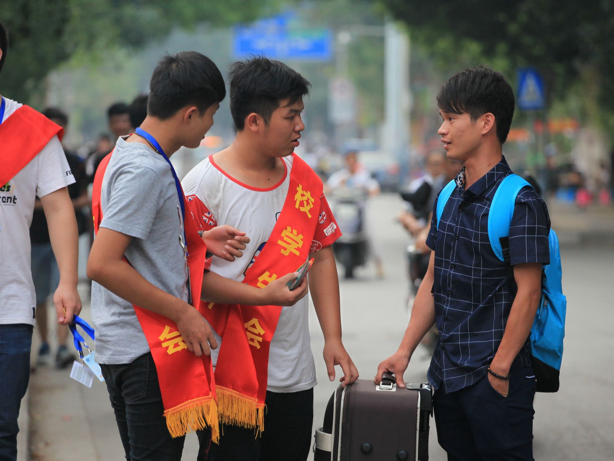 针对部分自己来的学生和家长,志愿者们负责在东环路口公交站到社湾坳、学校门口等直通到注册点的主干道上设点,指引学生进校报到,确保学生顺利注册。