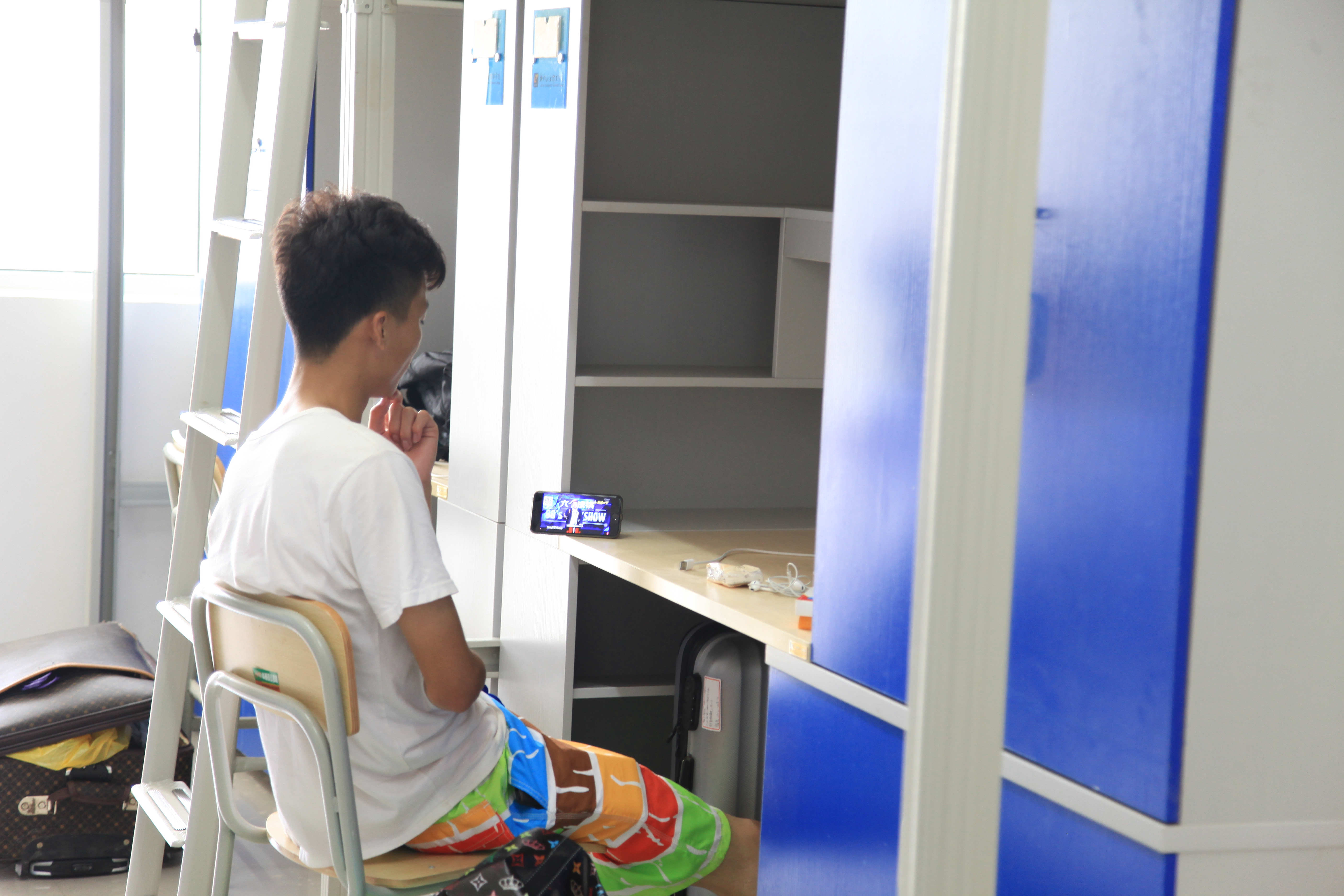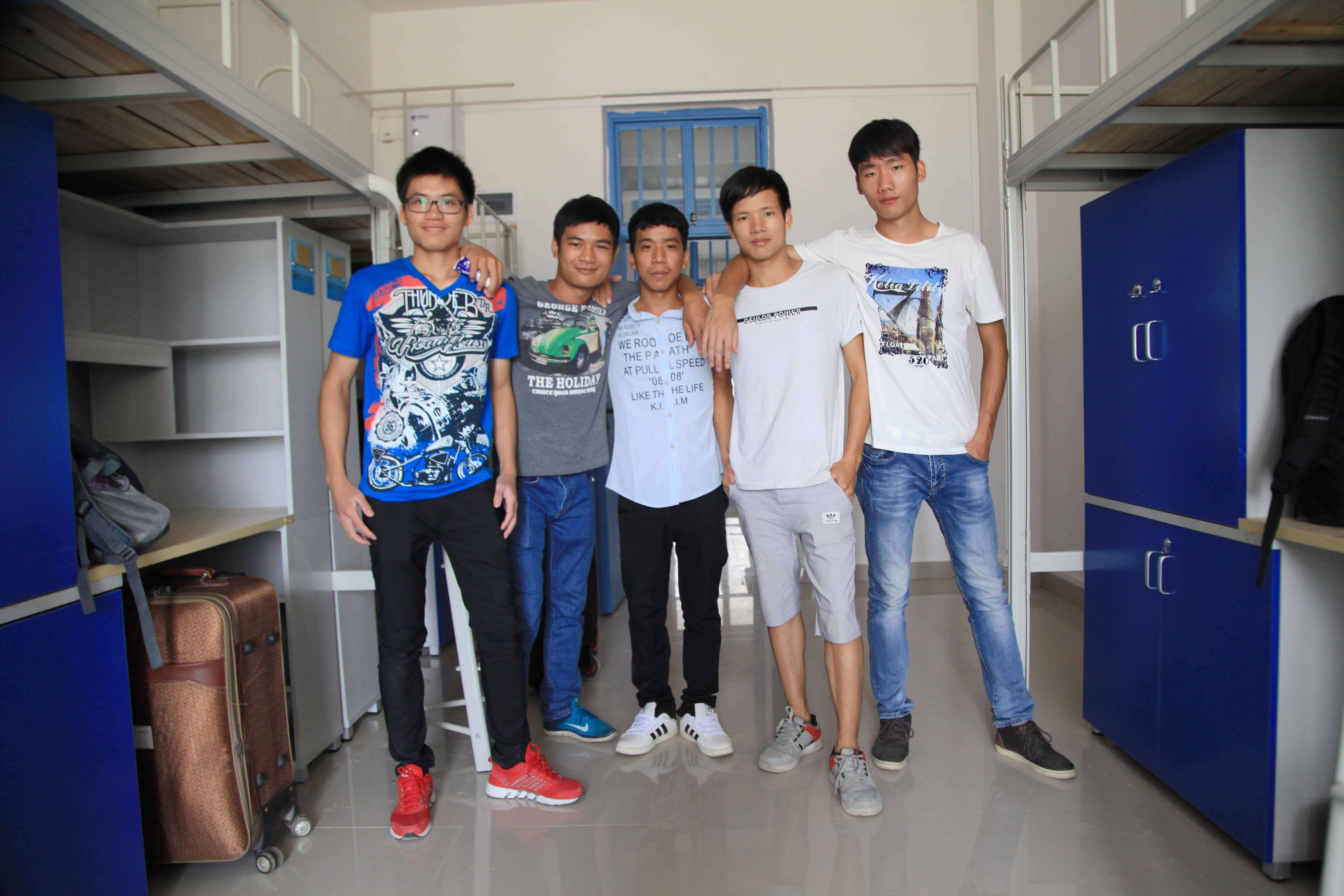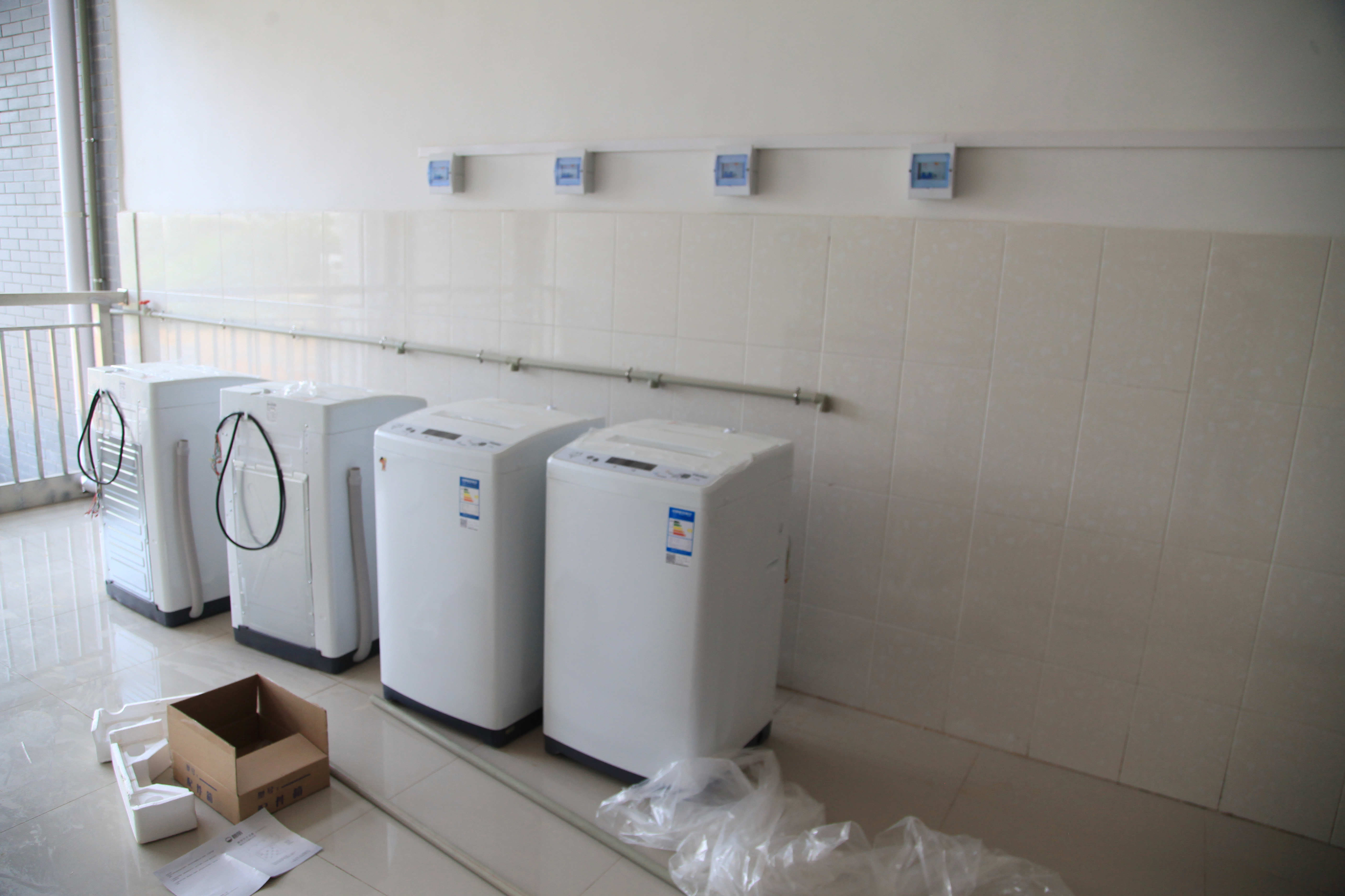 跟着2014届的陈辉、黄阳光、钟朝明三位老生上楼,在拧钥匙打开门的那一瞬间,三人被漂亮的宿舍设施惊呆了,不约而同地发出一阵整齐的惊叹声“哇……”这是一个5人间的公寓,上面是床铺,下面是衣橱和书桌,拥有两个卫生间、一个大的洗漱池,水通、电通、网络通,信号满满哒,给电动车充电也是好方便的哟!过道上还有供应开水的取水机和四个洗衣机,哈哈,衣服不用自己洗……看到这一切,孩子们争着喊着两个字:“满意!”