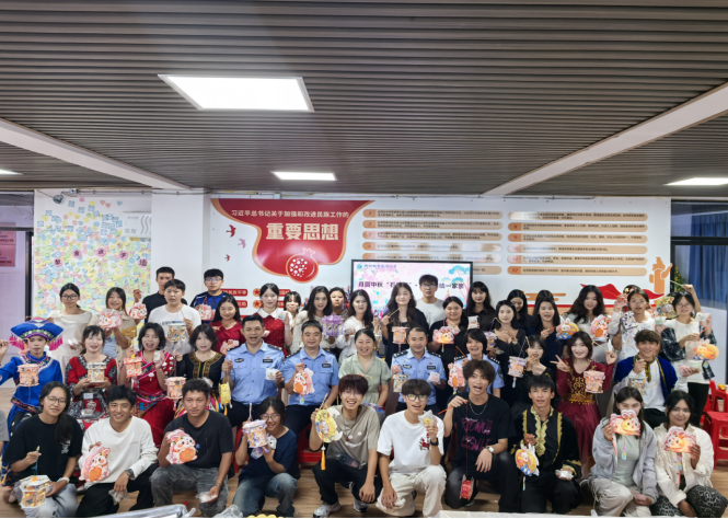 新闻网消息(文、图/党委学生工作部(处)程志媛)为深化民族团结教育,促进各民族学生交流交融交往,2025年9月28日晚上,我校在官塘校区D3“石榴籽”民族团结工作站(“石榴籽”辅导员工作室)精心策划的“月圆中秋‘石榴籽’民族团结一家亲”主题活动温情启幕,党委学生工作部(学生工作处)副处长曾志、柳东官塘派出所所长程东辉等出席,与来自各二级学院的62名民族学生共度佳节,以文化为桥、以活动为媒,绘就了一幅“中华民族一家亲”的生动画卷。