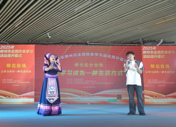 新闻网消息(文/艺术学院 邓常萍 图/校企合作处 黄志卫)为全面贯彻党的二十大精神,认真落实建设全民终身学习的学习型社会、学习型大国的要求,进一步推动建设泛在可及的全民终身学习体系,展示我市社区教育建设成果,2025年10月26日上午,由柳州市教育局主办,柳北区教育局、我校承办,柳北区解放街道办事处、广西地王新天地商业管理有限公司协办的“2025年柳州市全民终身学习活动周(柳北会场)”开幕式在地王新天地举行,活动主题为“让学习成为一种生活方式”。柳北区教育局、柳北区解放街道办事处、我校等有关领导、嘉宾出席开幕式,各相关单位人员和辖区市民参加开幕式并观看演出。