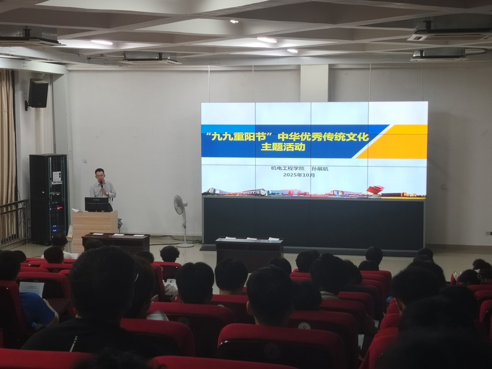 新闻网消息(文/机电工程学院 孙展航 图/机电工程学院 刘丽园)岁岁重阳,今又重阳。为传承中华优秀传统文化,厚植青年学子的文化自信与敬老情怀,在10月29日重阳节当天,机电工程学院举办“九月九重阳节”中华优秀传统文化学习活动。本次活动分别在T1-D401、T3-B404举行,由机电工程学院教师孙展航、刘丽园主持,来自机电工程学院的200余名同学参加,在沉浸式体验中探寻重阳文化的深厚底蕴,共赴一场别开生面的文化之约。