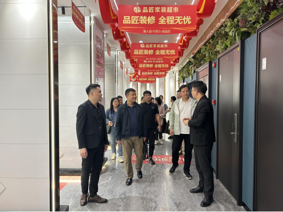 覃宏枫等八人陪同贾洪峰一行参观了品匠家装超市的各个分区。覃宏枫全面介绍了品匠集团的发展历程,并从企业高度重视客户的体验感、全方位为客户着想等多个角度介绍了企业“以客户为中心”的服务理念。邱义从“一站式整装服务”“专业施工团队”“材料品质保障”等多个维度介绍了企业的竞争优势,并详细阐述了品匠集团“施人品、行匠心、成品匠”企业精神的内涵。
