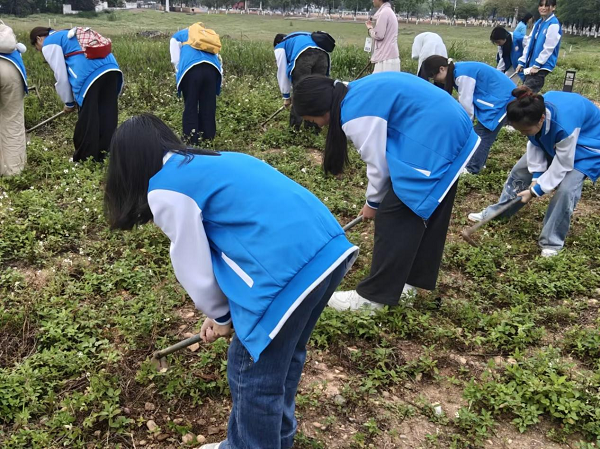 在劳动过程中,同学们不仅是在除草,更是在“雕琢”景观。大家弯腰徒手拔除浅根杂草,细致清理草坪缝隙;手持工具深挖顽固深根,防止杂草“春风吹又生”;专人负责垃圾分类打包,践行绿色环保理念。烈日下,汗水浸湿了衣角,泥土沾满了鞋面,但没有一人叫苦叫累。