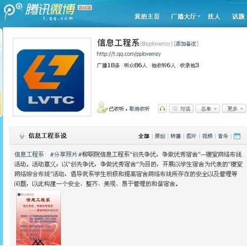 5月17日,“信息工程系”腾讯微博开通,向广大同学发出号召,同学们纷纷登陆微博进行收听、转播,表现出较高的热情。
