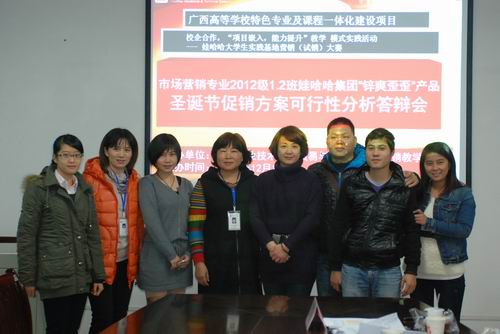答辩会专家不仅由营销团队教师组成,还请来了3位校外企业专家:娃哈哈集团柳州分公司渠道部阮均经理和推广部主管潘小龙、余新燕。阮均经理十分赞赏该专业这种市场调研(资讯)-制定方案(决策计划)-答辩修改(检查)—实施(评估)的考核方式,不但巩固了学生书本上的理论知识,而且提高了学生的实践营销能力。专家们也用他们丰富的实战营销经验为同学们的促销方案有针对性地提出了宝贵建议,为方案的实战操作性提升不小。各学习团队的促销方案均得到了3位专家的认可,特别是2012级市场营销1班的梦之翼团队的促销方案更是得到一致赞赏,该方案修改之后或可被娃哈哈公司采纳。