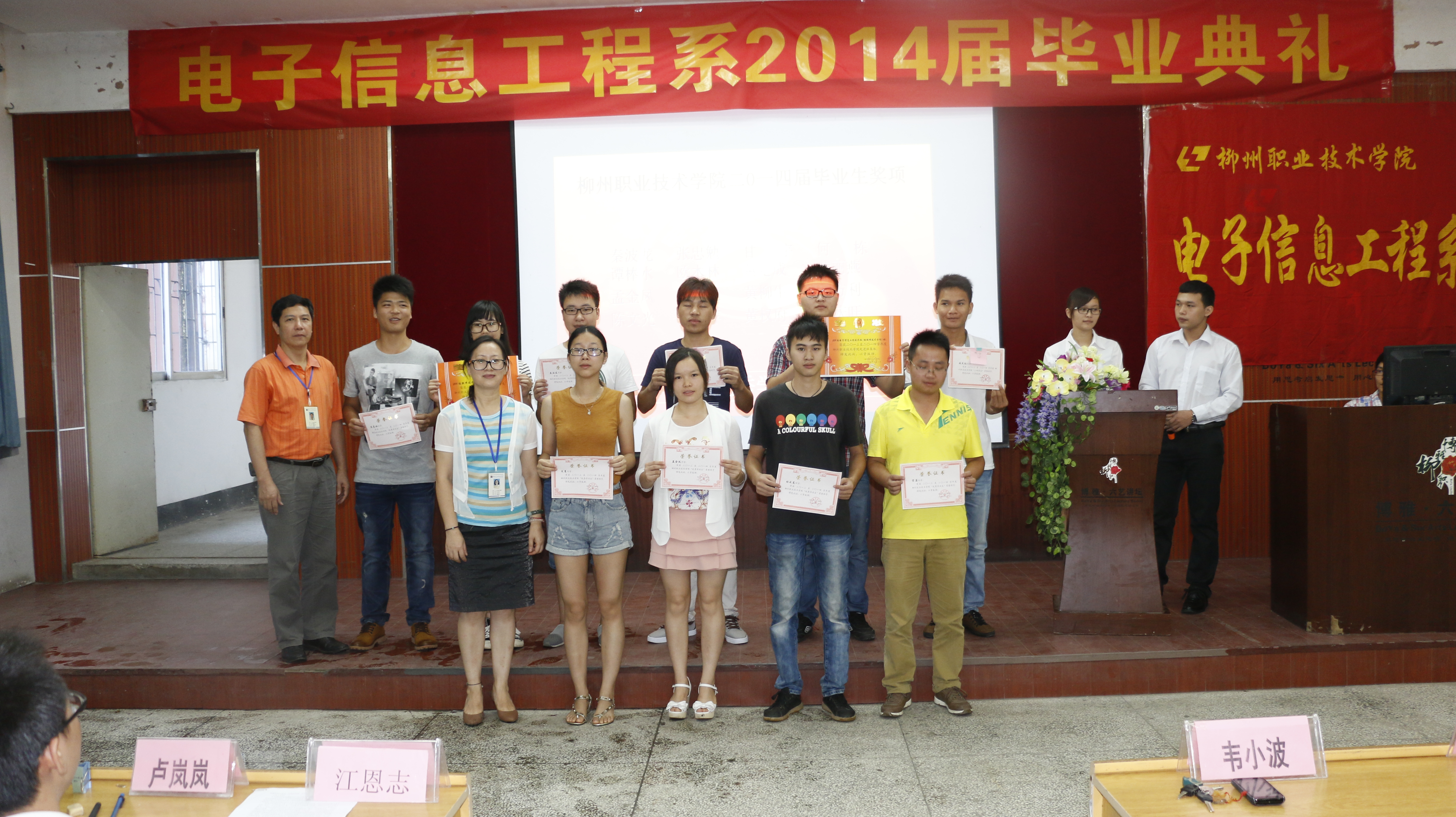 典礼在雄壮的国歌声中拉开序幕,系主任韦小波致毕业贺词,韦主任向学业有成、即将告别母校、踏上新的人生征途的毕业生表示最热烈的祝贺,同时嘱咐同学们走出校门之后,无论遇到怎么样的坎坷挫折,请一定要向前看,用能力去改变能改变的,用胸怀接受不能改变的,做最好的自己,勇敢去追寻自己的梦想,做一个勇于创新的IT人,为社会多做贡献,成为母校的骄傲,电信系的自豪。接着,主持人宣读了该系2014届区优秀毕业生、院优秀毕业生、优秀学生干部、三好学生、先进班集体名单,院领导和系领导分别为以上毕业生和班级颁发了证书。