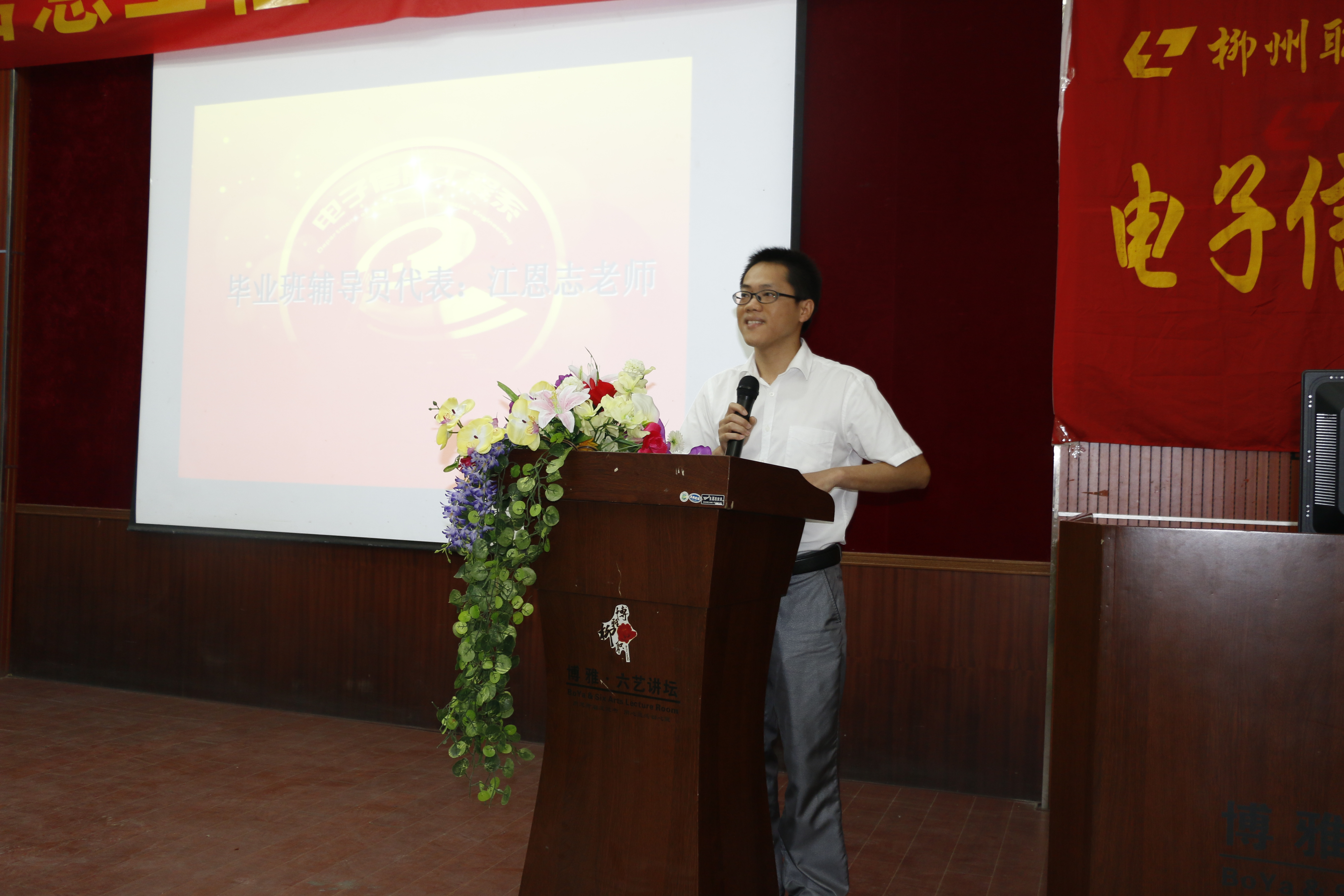 系优秀教师代表莫徽忠发言,表示毕业并不意味着结束,而是蕴含着开始、进步,希望2014届全体毕业生常回家看看,让母校共同分享成功的喜悦。随后,毕业班辅导员代表江恩志发言,他希望毕业生们在人生的奋斗历程中始终把最正面最美的一面朝向自己,朝向亲人,朝向母校,朝向社会,要相信自己、鼓励自己。毕业生代表覃秋凤代表全体毕业生感谢三年来一直给予他们谆谆教导和关心的老师和母校:“老师,你们辛苦了!”同时也送上了对母校、老师、同学们、学弟学妹们的美好祝福。