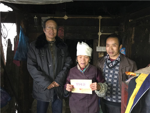 给另一位老人吴奶秀连(中)送上慰问金