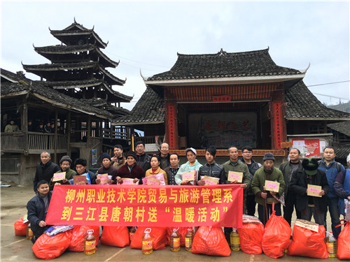 新闻网消息(通讯员/贸旅系 吴鹏)1月8日,在新春佳节来临之际,贸易与旅游管理系党总支书记牛永惠、学生科科长陈月明以及该系老师温长生、吴鹏一行,带着贸旅系全系教师6550元捐款和优农联盟刘远洋、区美娜300元捐款(共计6850元),赴三江县独峒乡唐朝村开展“送温暖”活动,为三江县唐朝村16户五保户送去慰问金、棉被、油等慰问品。