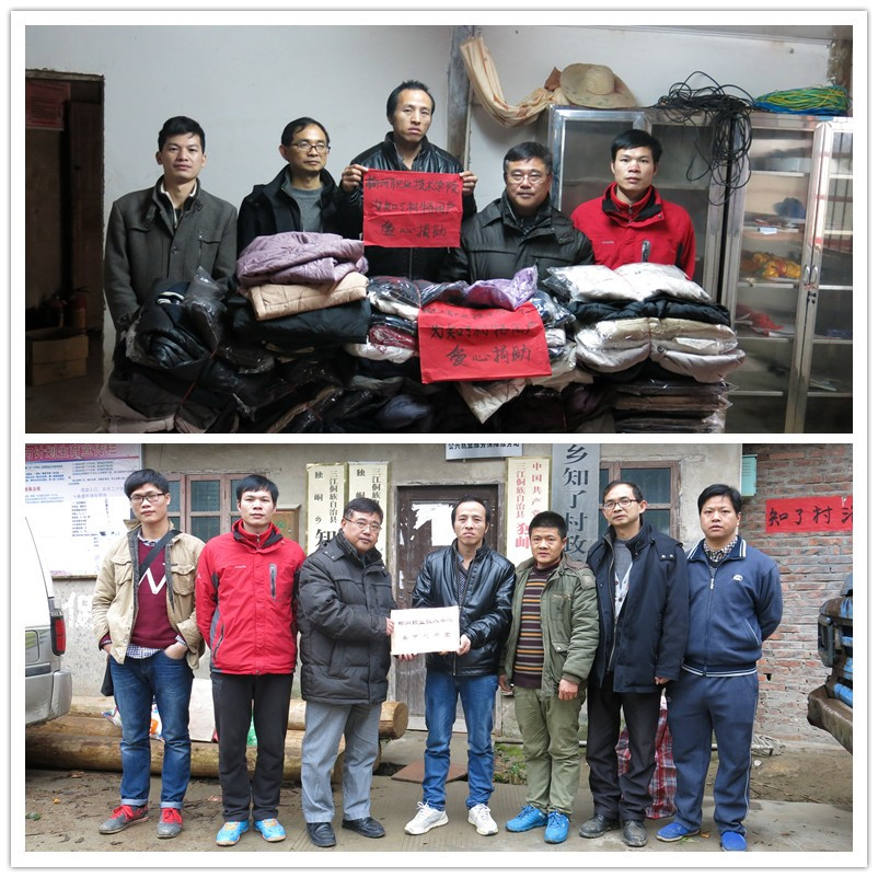 其中,知了村是公共基础部钟磊和覃扬强2位精准扶贫队员的驻地村,为了支持他们的精准扶贫工作,帮助驻点村特困户解决部分生活困难,公共基础部向全体教职工发出倡议书,号召教职工向驻点村贫困群众捐款捐物,得到积极响应,共收到捐款总额6310元,衣物200多件,图书210册,被褥、鞋帽若干。知了村委接收了公共基础部的爱心捐赠,并于近日与精准扶贫队员一起将受赠款项和物品逐一发放到经过精准识别筛选的特困户手中。