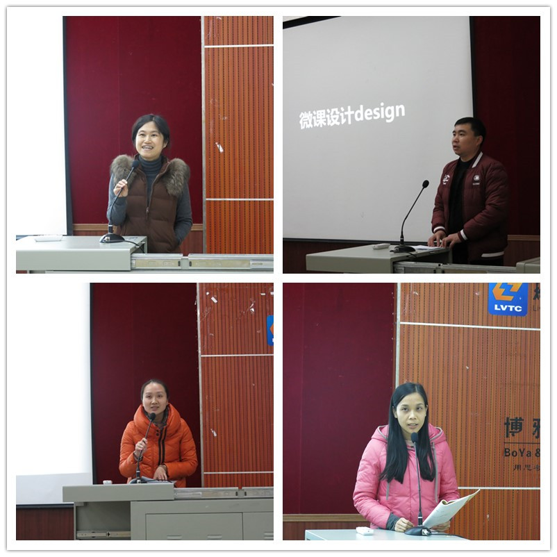 1月19日下午,在德馨楼101教室召开期末教研汇报会,各团队分别派出一位代表汇报“说信息化教学”教研活动成果。各团队代表在会上分别就微课的含义、特点、设计、载体、技术、使用等方面问题分享了自己的观点,不同教师间不乏理念上的冲突,但正因为不同观点之间的碰撞,更加深了教师们对微课的理解。