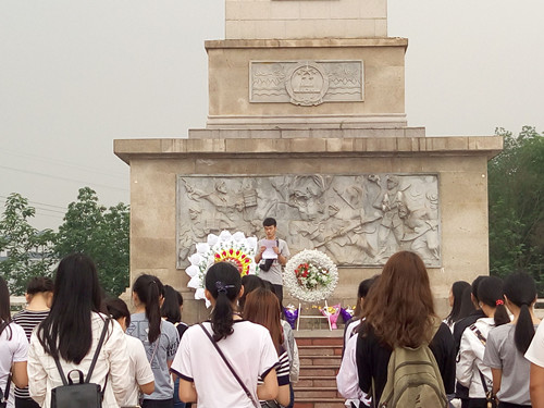 早上8时,同学们在庄严的纪念碑前,向革命烈士纪念碑敬献了花圈。全场肃立、默哀三分钟,寄托了对烈士们的无限哀思。学生代表致辞,深切缅怀了英雄们的革命事迹和不屈不挠的斗争历程。随后全体同学举手庄严宣誓,承诺将继承共产党人的优良传统,坚定理想信念,勤勉自励,锐意进取,不负先辈厚望,建设锦绣中华。仪式结束后,全体同学井然有序的绕烈士墓一周并敬献小白花,之后有序离场。