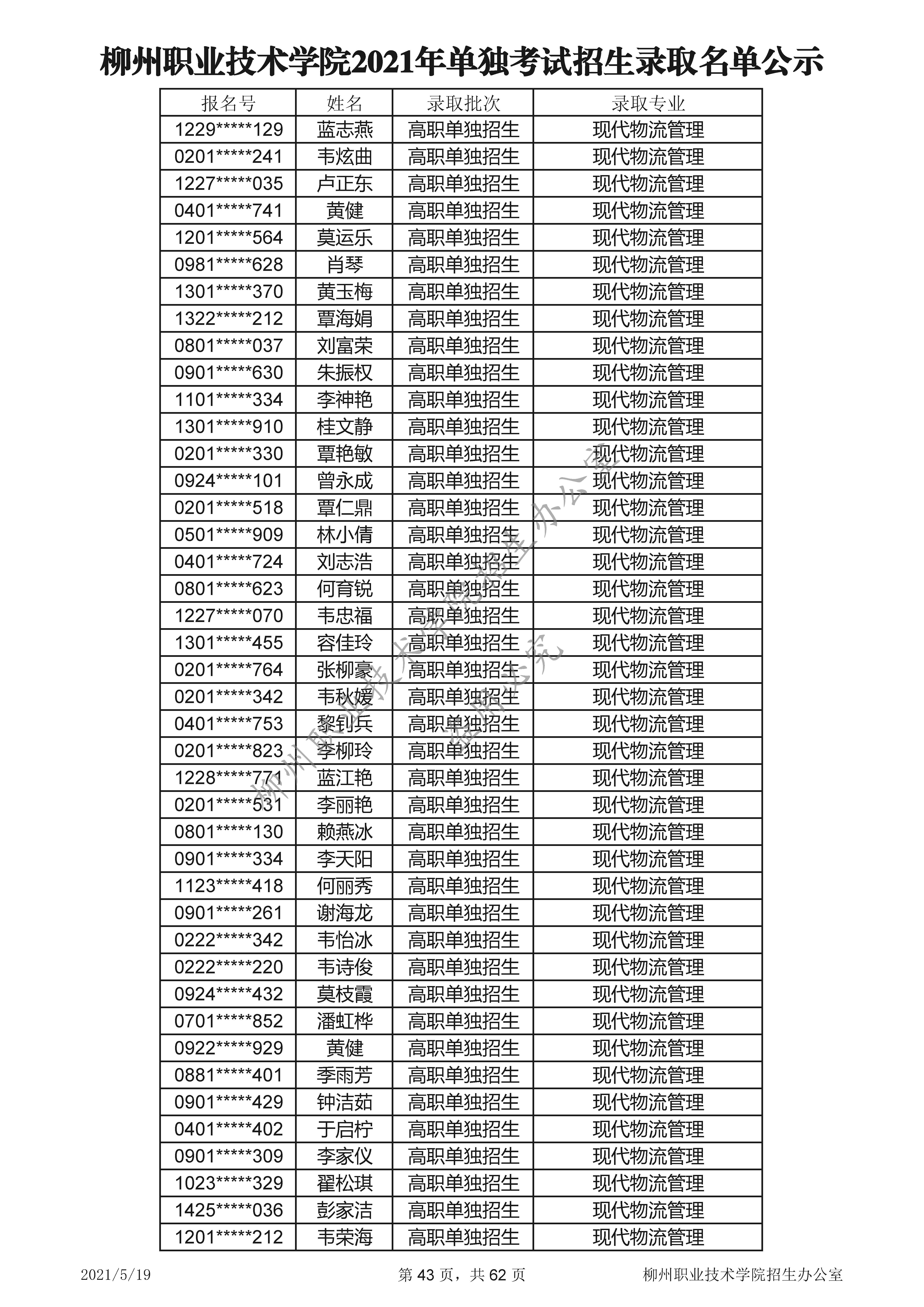 根据《关于做好我区2021年高等职业院校单独考试招生和高等职业院校对口中等职业学校毕业生自主招生试点工作的通知》(桂招考委办〔2021〕1号)等文件要求,按照广西招生考试院统一安排,我校2021年单独考试招生录取工作已经结束,招生计划已经录满,录取名单已通过广西招生考试院审核。按照我校《柳州职业技术学院2021年招生章程》(柳职院字〔2021〕31号)的规定,现对我校单独考试招生录取名单予以公示(名单附后)。