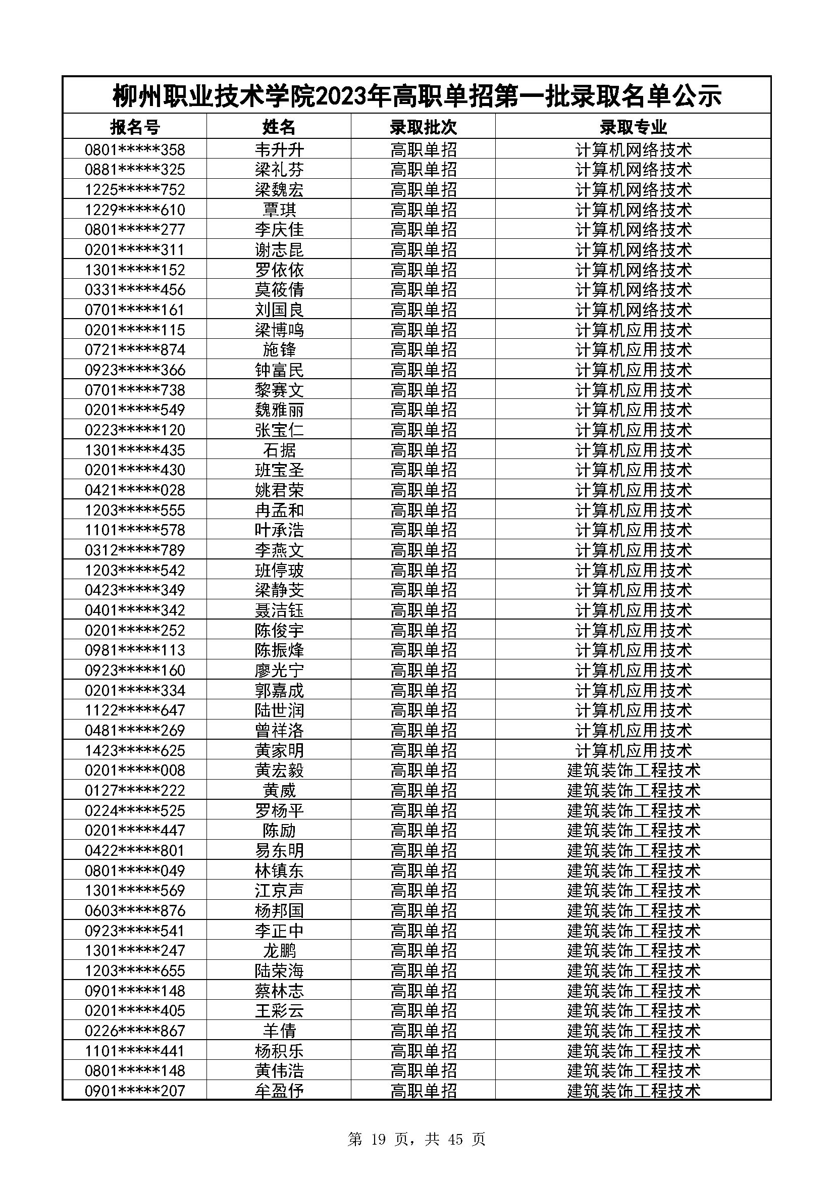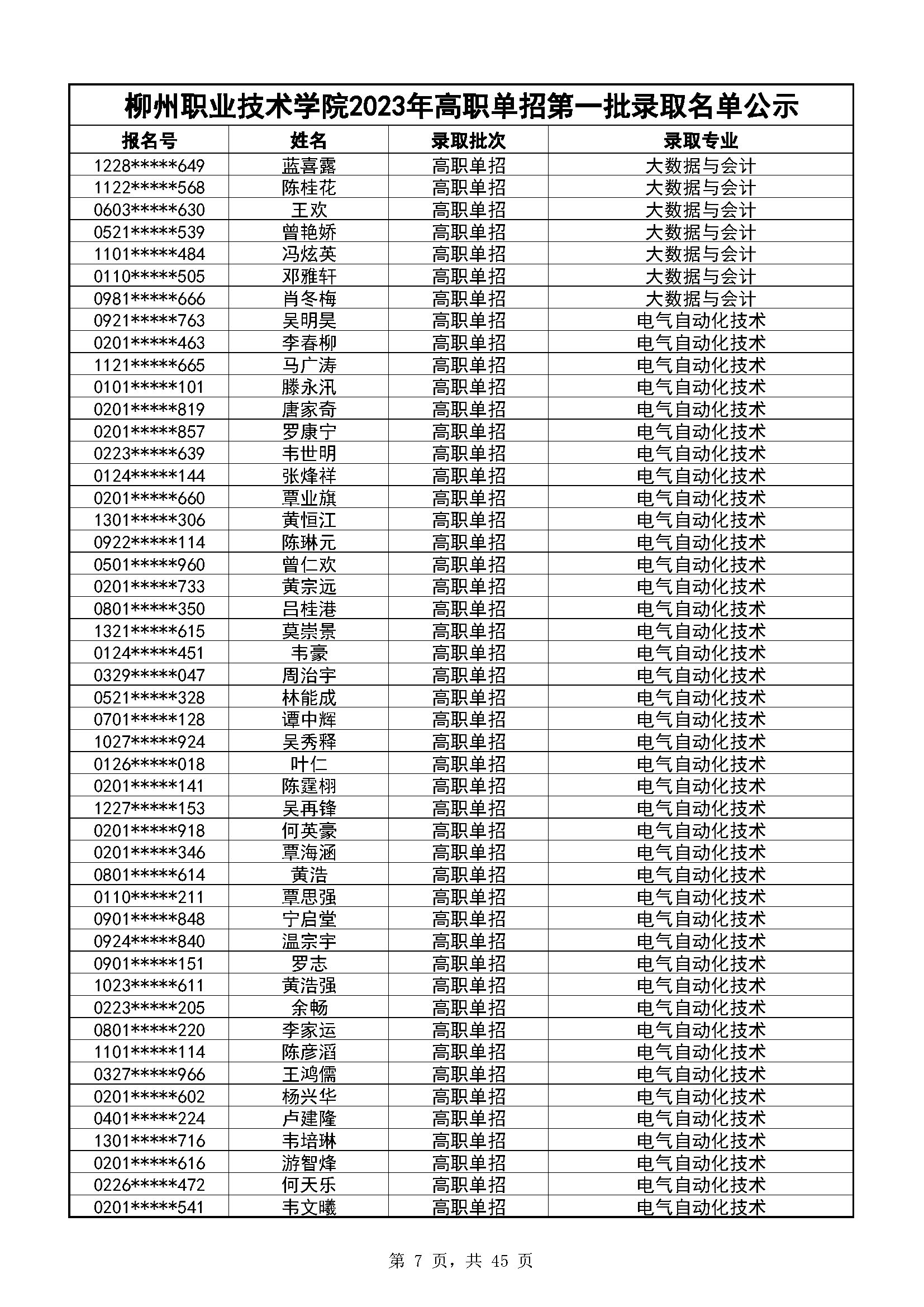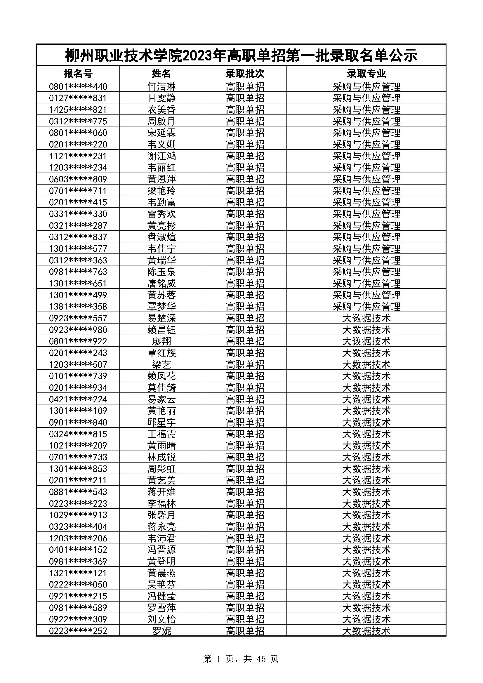 柳州职业技术学院2023年高职单招录取名单公示(第一阶段)