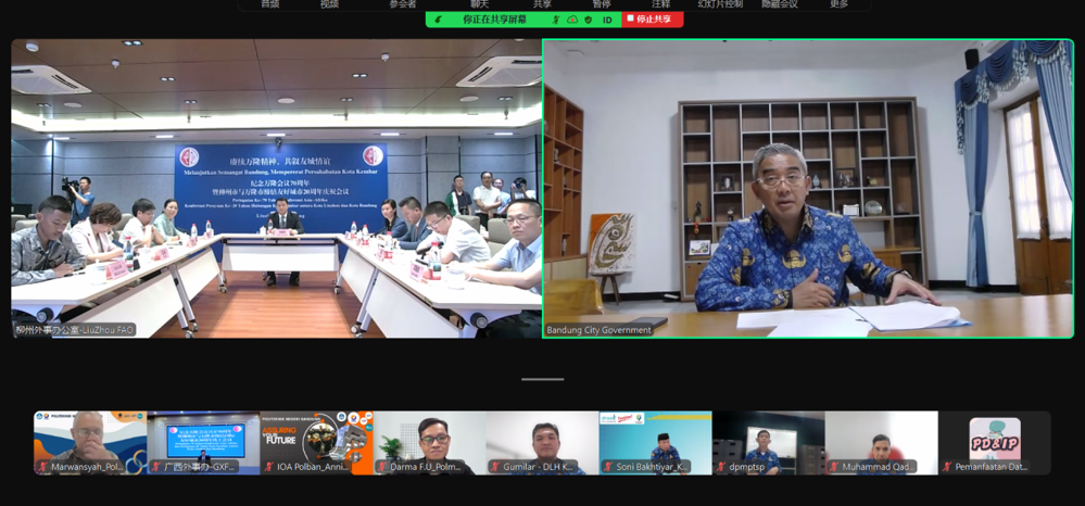 From News Center (Text by Zuo Yingzi, International Exchange Department; Photos by Zhang Jinyezi, International Exchange Department) On April 21, 2025, an online meeting commemorating the 70th anniversary of the Bandung Conference and the 20th anniversary of the establishment of international friendly cities between Liuzhou and Bandung was held. As a representative in the field of vocational education, LZPU was invited to attend the meeting. Together with representatives from all walks of life in the two cities, we reviewed the history of friendship and looked forward to the prospects for cooperation, focusing on the fruitful results and future plans of vocational education cooperation. The presidents of Politeknik Manufaktur Bandung (POLMAN Bandung) and Politeknik Negeri Bandung (POLBAN) were also invited to attend the event to share their cooperation experience.