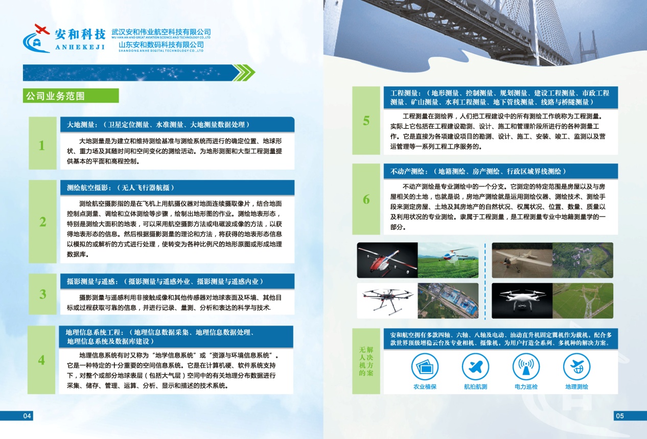 武汉安和伟业航空科技有限公司从成立初开始涉及航空摄影测量内业数据处理业务、地理国情普查、农村土地承包经营权确权项目,农村宅基地确权项目,及逐步完善发展,成为今天拥有航测内业、航测外业、航空遥感摄影、工程测量,不动产测量,地理信息系统工程,无人机地质灾害勘察的高新技术民营企业。